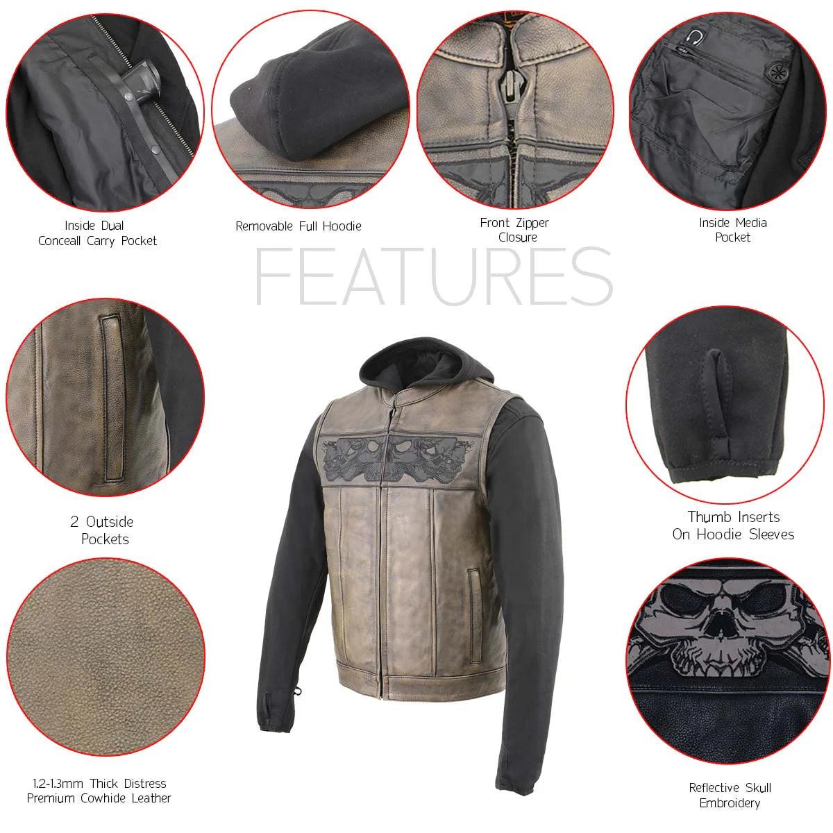 The Milwaukee Leather MLM3561 isn’t just a vest β€” it’s a full‑blown statement piece built for riders who want rugged style, real functionality, and gear that adapts to every ride. With its distressed brown leather, reflective skull detailing, and a full removable hoodie, this vest delivers the perfect mix of edge and versatility.